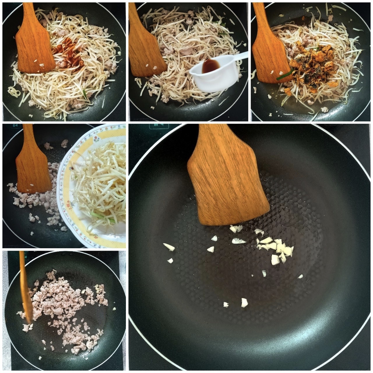 Step4:依次放入豆芽,淋入蚝油、酱油与水,快速炒至豆芽稍软;