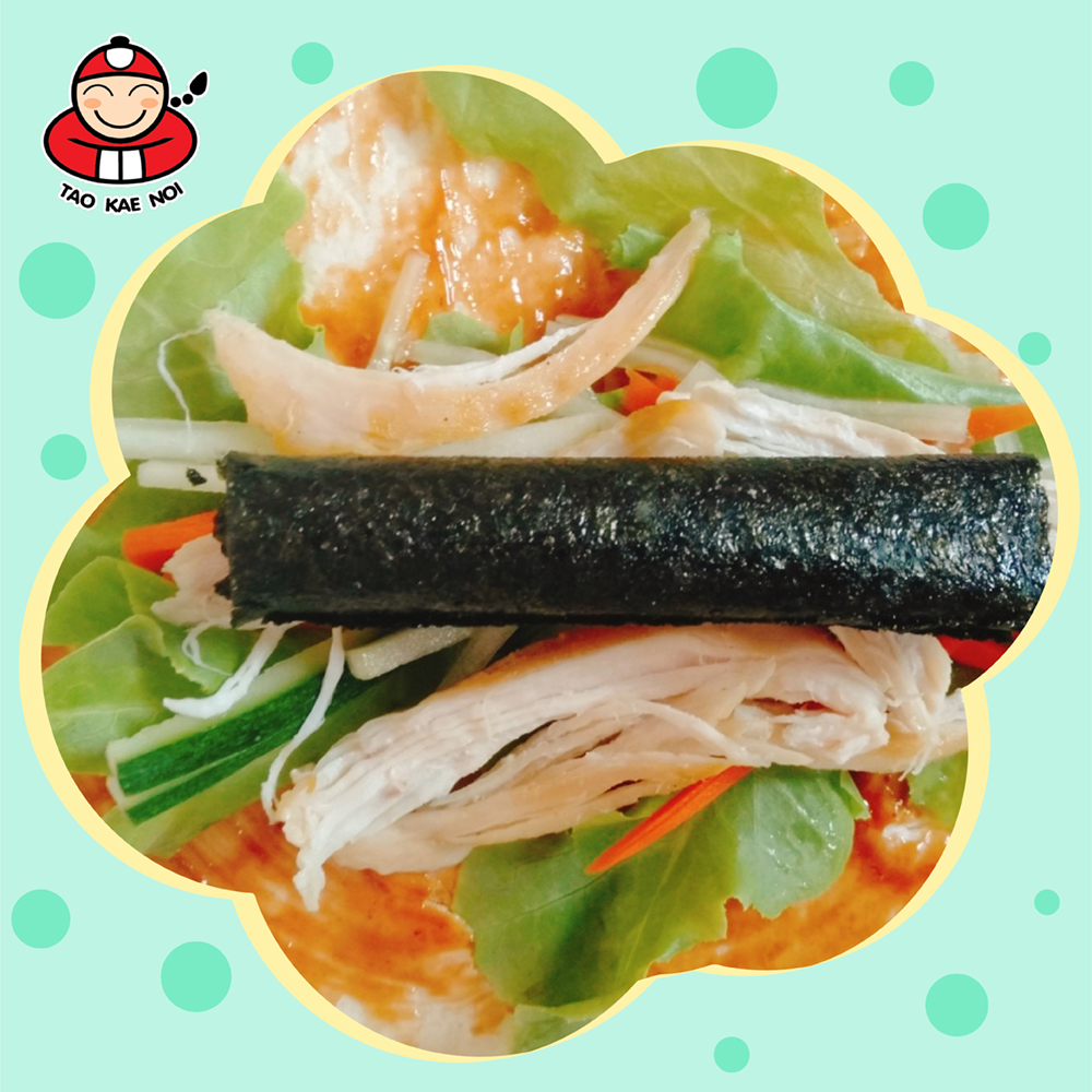 Step4:拿出煎好的薄饼,将番茄酱涂抹均匀,并放上生菜、胡萝卜丝、黄瓜丝、老板仔Bigroll海苔卷、鸡肉丝。